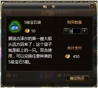 点击“5级宝石袋”,弹出面板上输入购买个数。(宝石袋不能叠加,请注意背包内的空位)