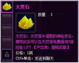 11. 新增【天焚石】道具,可在天焚炼气塔中,抵扣任意一次强领5倍经验的费用,越后用越划算,在每日登陆奖励中可领取3个
