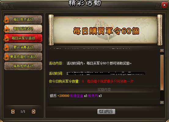 活动内容:活动时间内,每日买军令60个即可领取奖励。