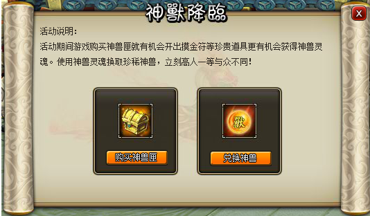 1.          玩家点击活动入口,可选择购买神兽匣或兑换神兽。