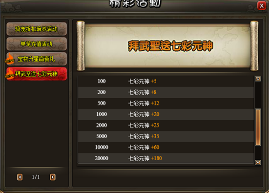 活动内容:活动时间内,每日拜武圣消费指定额度即可获得相应阶梯的七彩元神奖励!