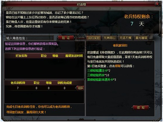 在这个面板可以对离线超过20天等级大于70好友进行发起邀请,当对方验证后,可以领取大量超值道具,邀请越多领取次数越多